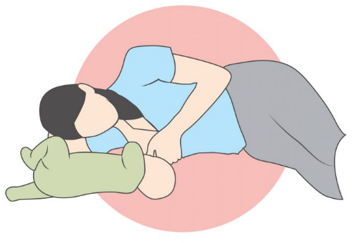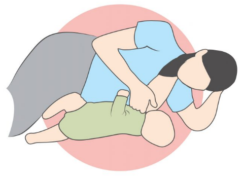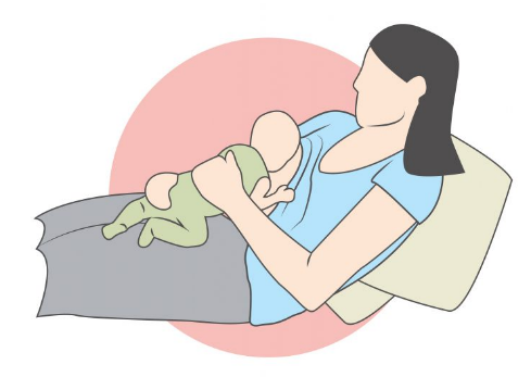 Προσφέρει ανακούφιση στις μητέρες που πονούν στην περιγεννητική περιοχή, λόγω καισαρικής τομής, περινεοτομής μετά από φυσιολογικό τοκετό ή αιμορροΐδων. Όταν επιλέγεται αυτή η θέση, η μητέρα πρέπει να προσέχει να μην αποκοιμηθεί, δεδομένου ότι το μωρό θεωρείται ασφαλές όταν κοιμάται στην κούνια του.